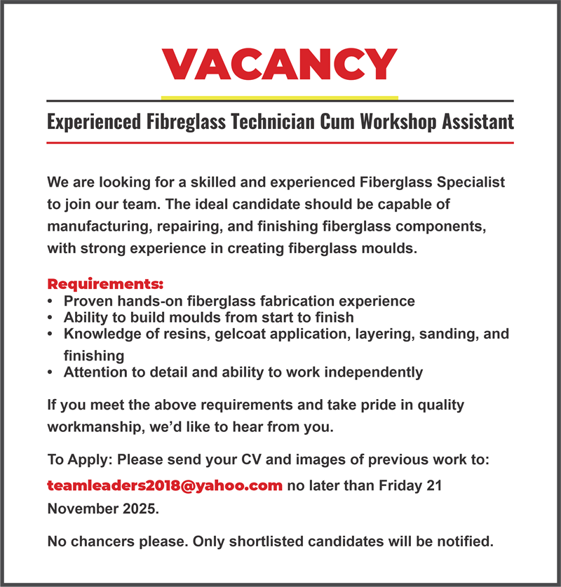 VACANCY: Experienced Fibreglass Technician cum Workshop Assistant
